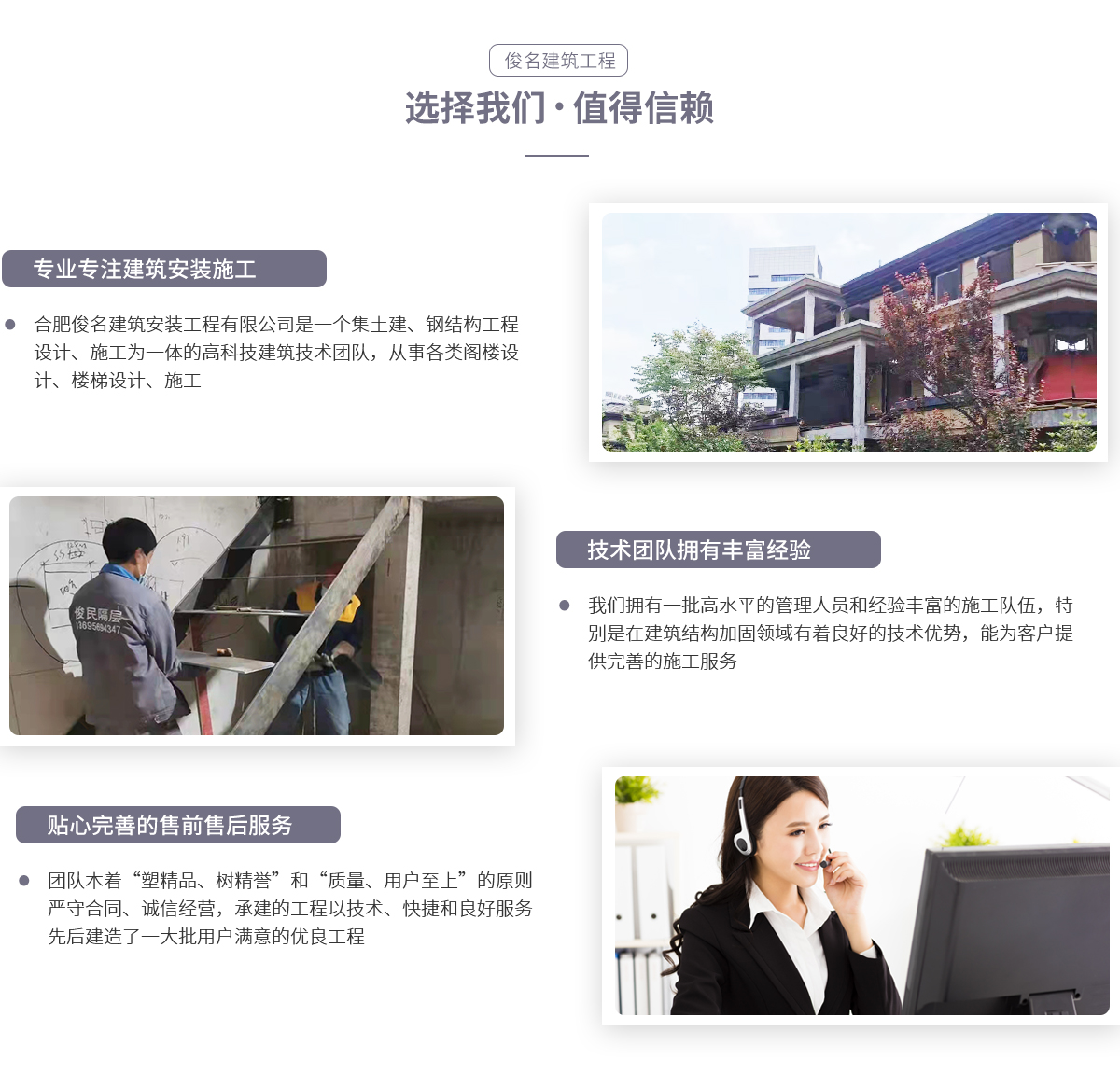 合肥俊名建筑安裝工程有限公司是一個(gè)集土建、鋼結(jié)構(gòu)工程設(shè)計(jì)、施工為一體的高科技建筑技術(shù)團(tuán)隊(duì),從事各類閣樓設(shè)計(jì)、施工。我們擁有一批高水平的管理人員和經(jīng)驗(yàn)豐富的施工隊(duì)伍,特別是在建筑結(jié)構(gòu)加固領(lǐng)域有著良好的技術(shù)優(yōu)勢(shì)。團(tuán)隊(duì)員工精誠(chéng)團(tuán)結(jié),以“尊重規(guī)范,拒絕平凡”為宗旨,為客戶提供完善的施工服務(wù)。團(tuán)隊(duì)本著“塑精品、樹精譽(yù)”和“質(zhì)量、用戶至上”的原則,嚴(yán)守合同、誠(chéng)信經(jīng)營(yíng),所...